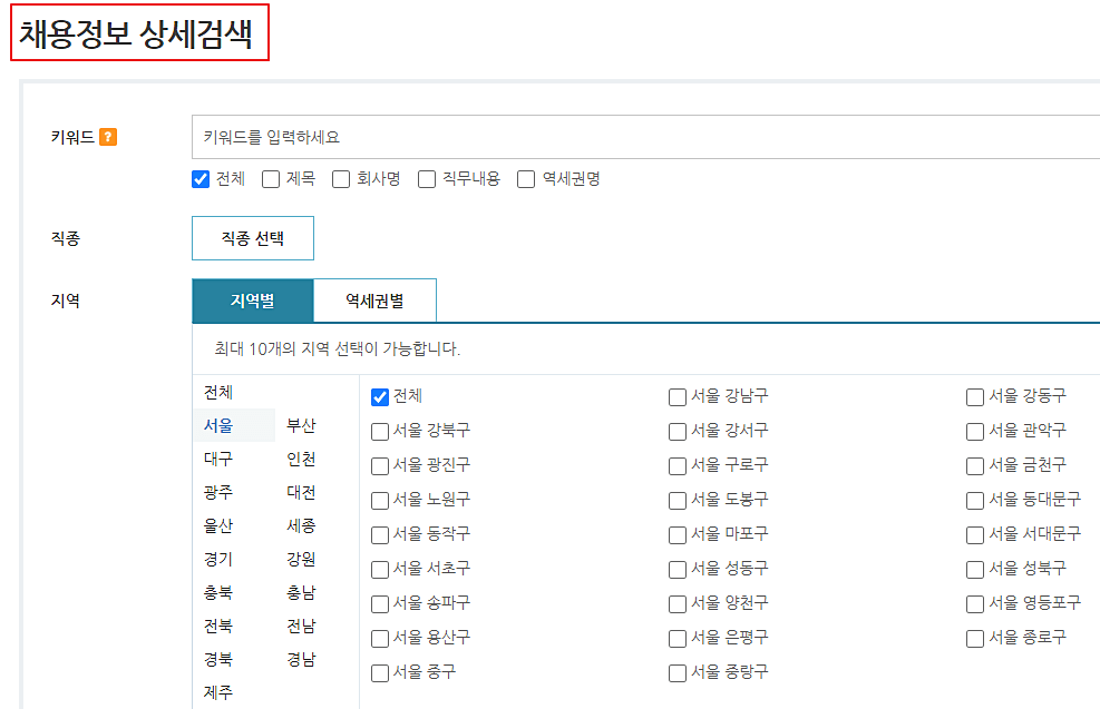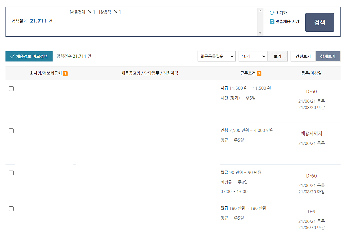 상세 검색을 입력하시면 내가 원하는 회사들을 확인할 수 있습니다. 회사에서 원하는 인재를 뽑기 위해 조건을 내걸었기 때문에 그에 적합한 인재라면 과감히 이력서를 작성해서 제출해보시길 바랍니다.
